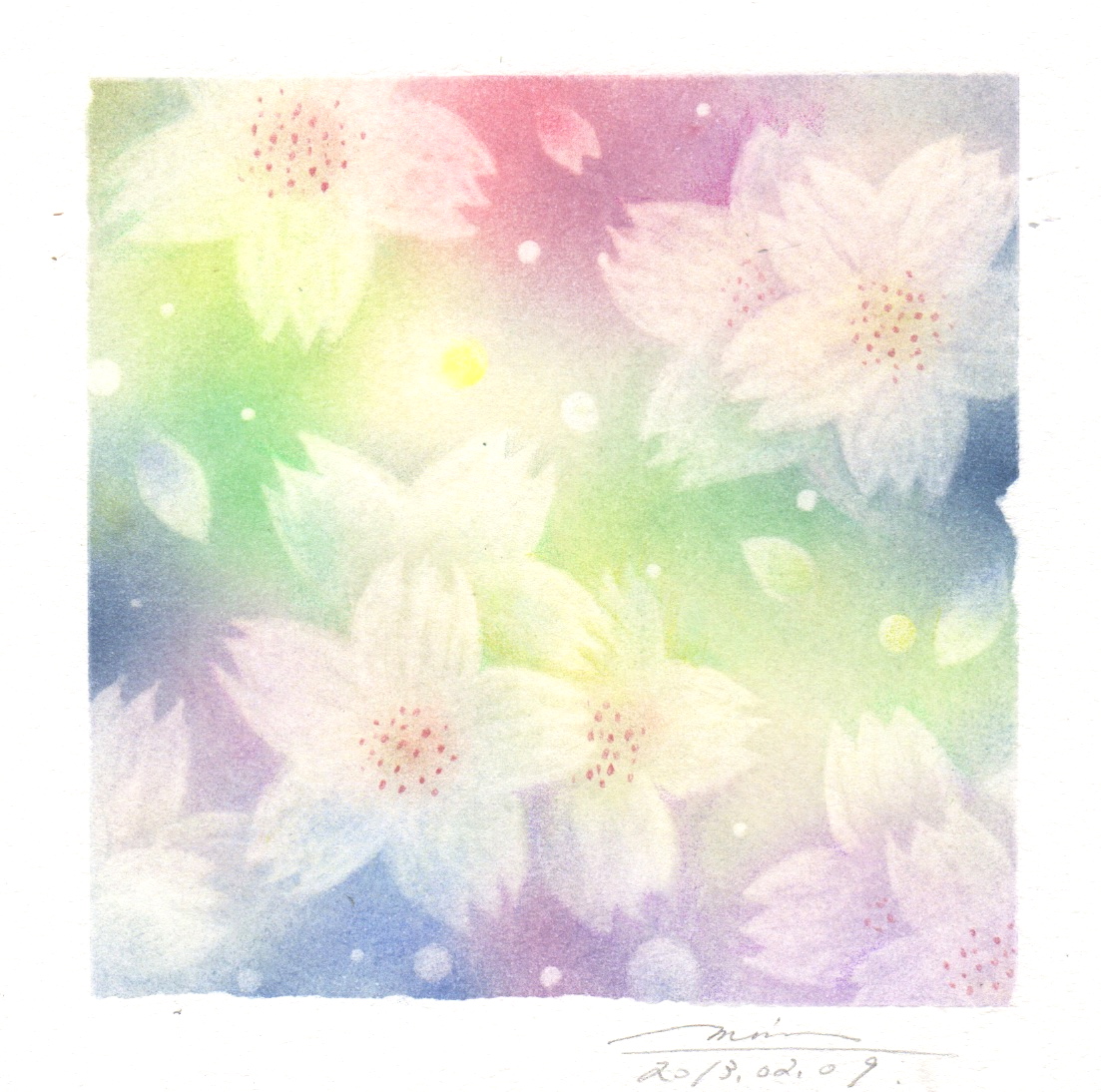 「土手の桜」はもう何枚も描いてきたのですが、こんな色で描くと、雰囲気がとても違いますね。いや〜、とても楽しかったです。